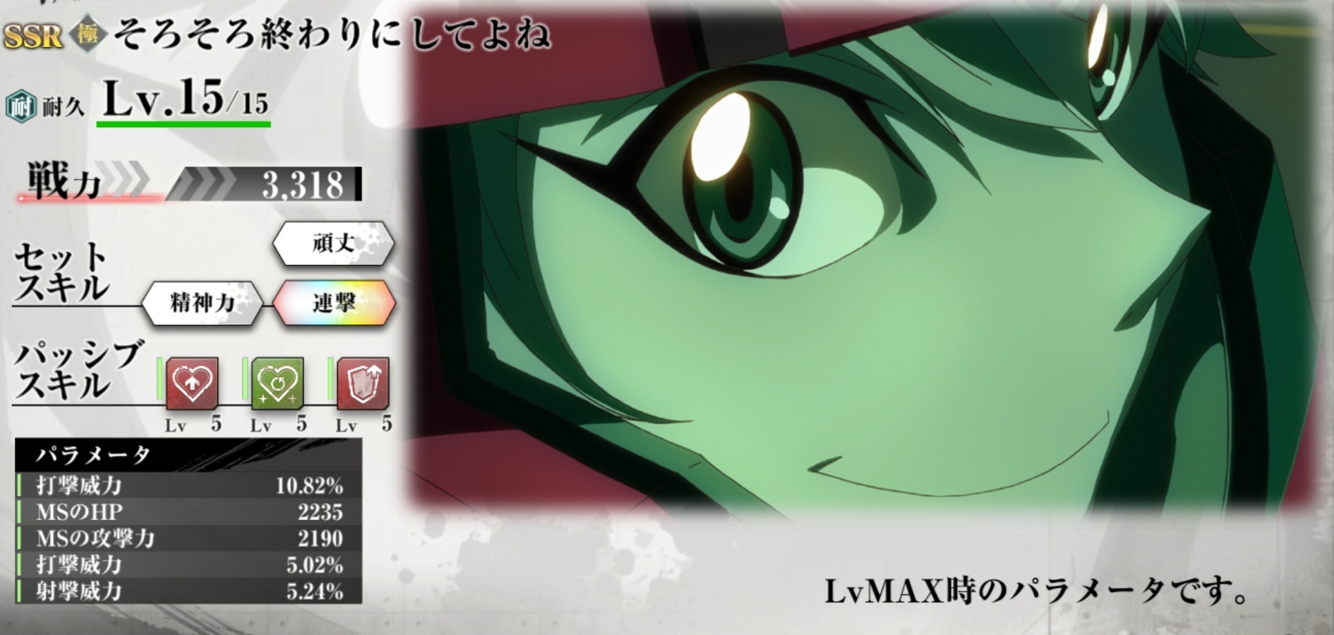 | 戦力 | 3,318 | セットスキル3 | 連撃 |