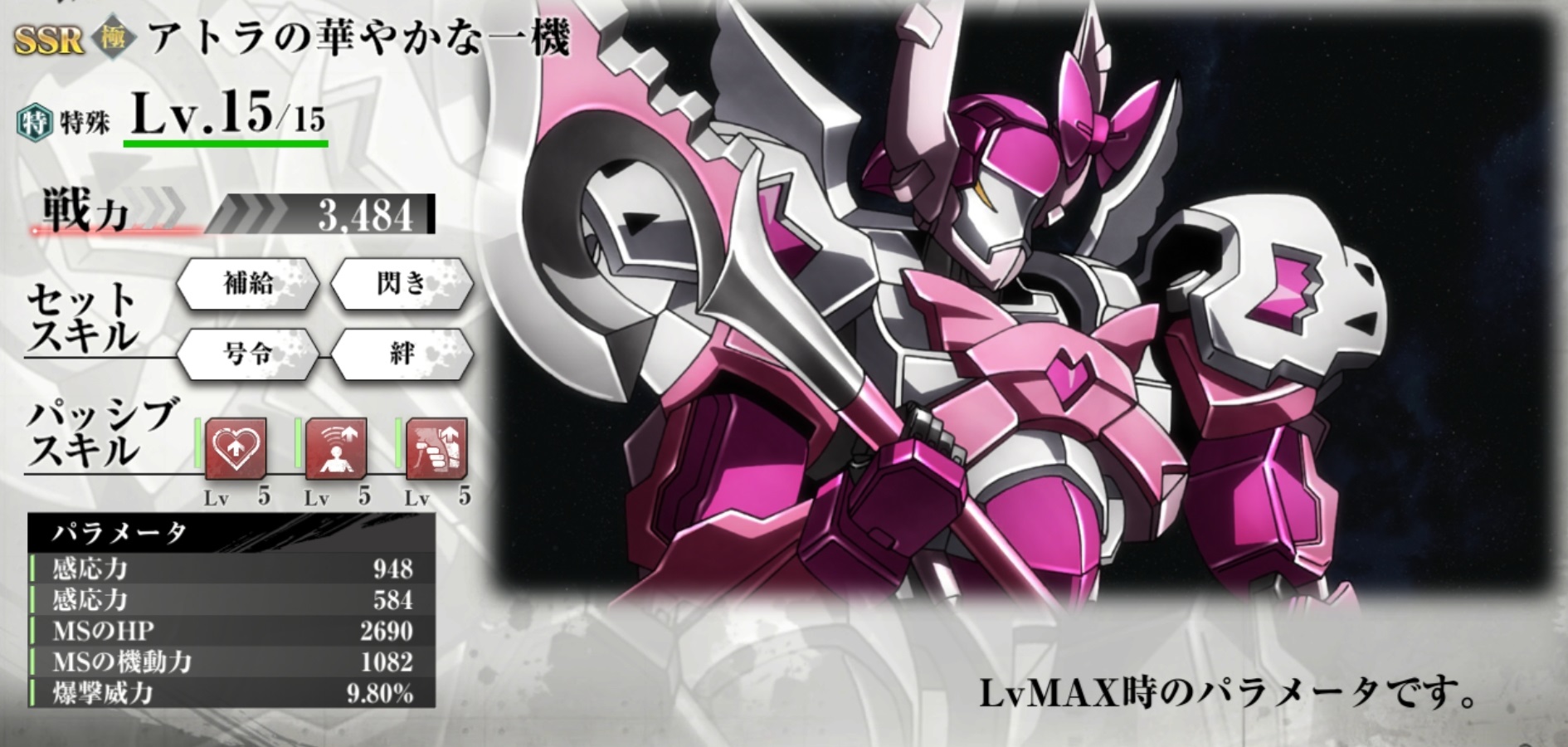 | 操縦力+1、ユニットHP強化 | パイロットの操縦力を1段階上昇する。バトルユニットのHPを2.0%上昇する。 |