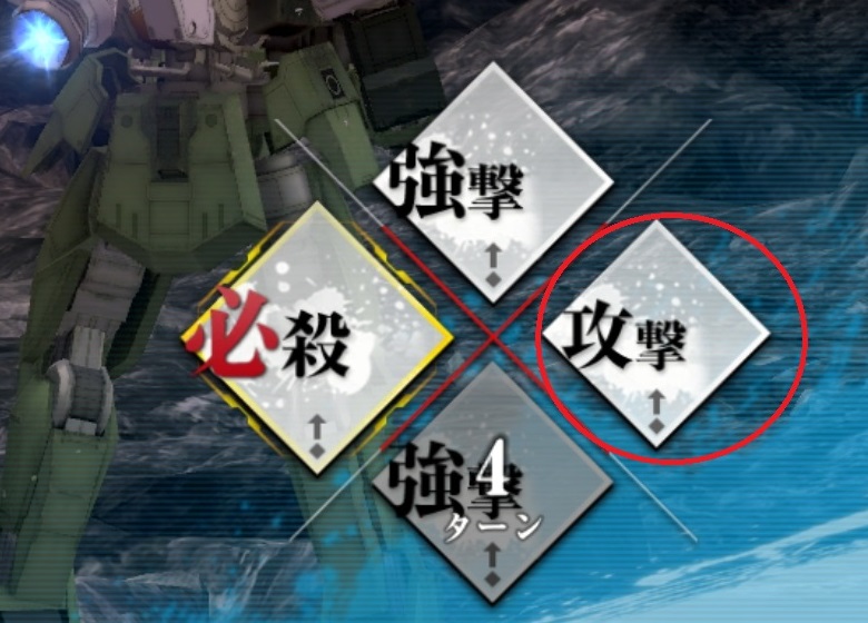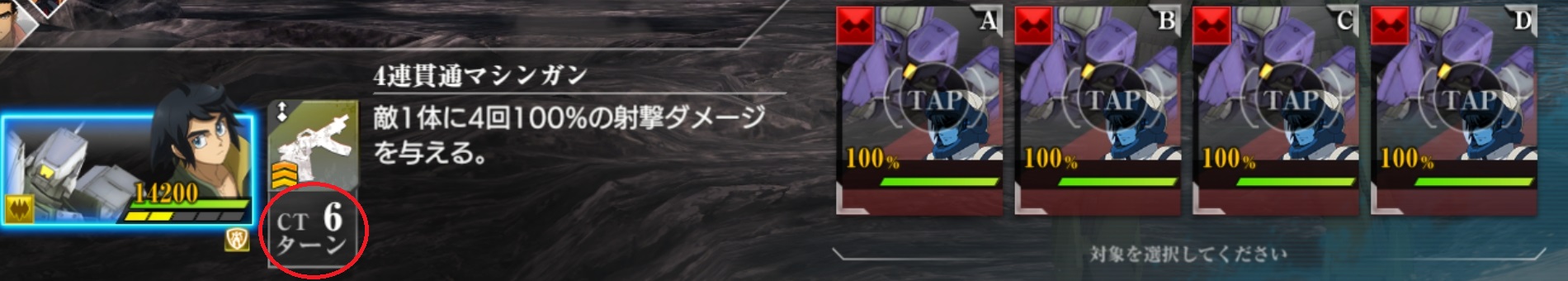 各MSの通常攻撃とコマンドスキルのクールタイム(以下CT)はステータス画面での閲覧はできません。 この二つを見るためにはまずそれらを見たいMSを編成した上でクエストを開始します。 次に目当てのMSの手番が回ってきた時に上記の画面で赤丸の攻撃の部分を長押しします。 すると通常攻撃の武器名や攻撃方法を見ることができます。 同様にコマンドスキル、今回の例では強撃を長押しすることで武器名や攻撃方法を見ることができます。 上記の画面で赤丸の部分がコマンドスキルのCTです。 このCTはリンクアビリティのCT減少等も反映された値となります。 wikiのデータとしてはリンク無しの状態のデータを取り扱っています。