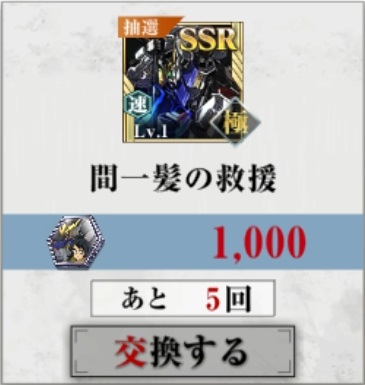 シーンカードを変換した時や限定ショップで購入したアイテムと交換できる。 オススメはRの各種Rユニット五個、特に何かと不足しがちなMS変換パーツα10個に変換できるグレイズ(アーレス所属機)【9.8mバトルアックス】[1290201]は毎月忘れずに交換したい。 他にはSSRのPLT交換チケット(特典)も良いのだが必要枚数が多いので厳しいかもしれない。