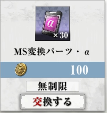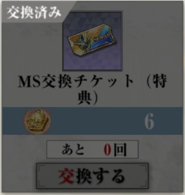 ガシャでMSがダブった時や限定ショップで購入したアイテムと交換できる。 オススメはSSRのMS交換チケット(特典)。